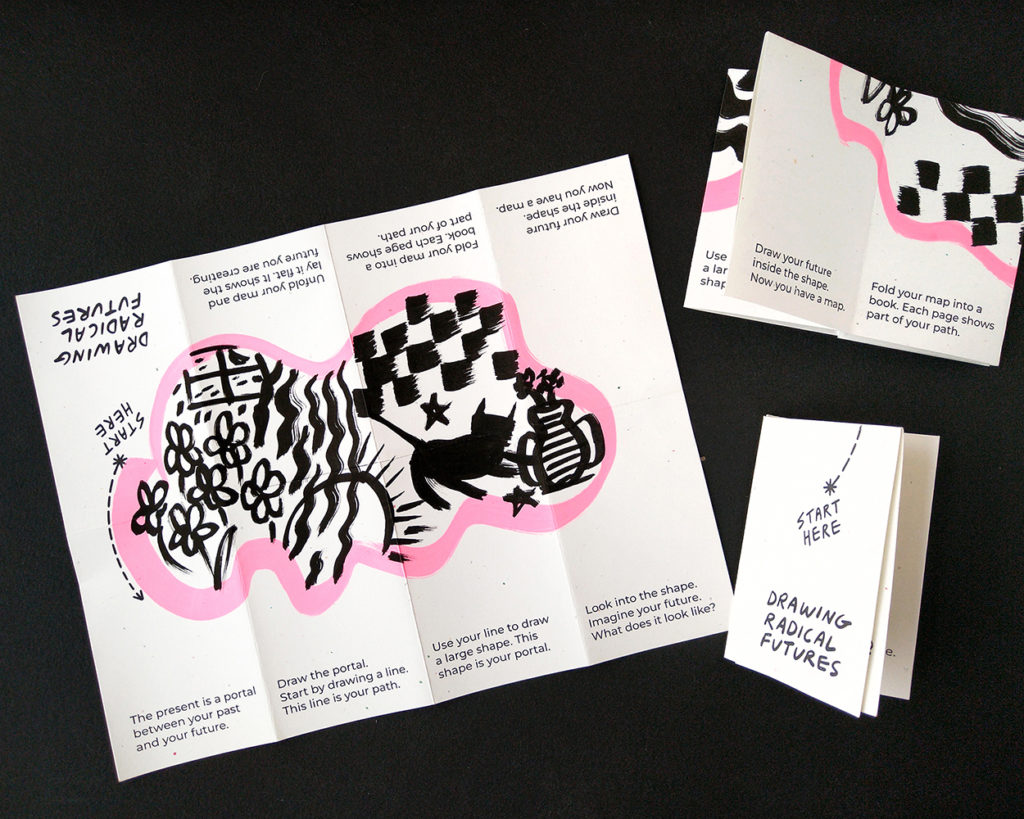 Drawing Radical Futures is an interactive drawing exercise commissioned by the Oklahoma Contemporary Art Center for the 2023 ArtNow biennial exhibition. The exhibition, titled “ArtNow: The Soul is a Wanderer”, is based on the poem A Map to the Next World by poet Joy Harjo. My drawing exercise guides visitors as they draw a map to their future.