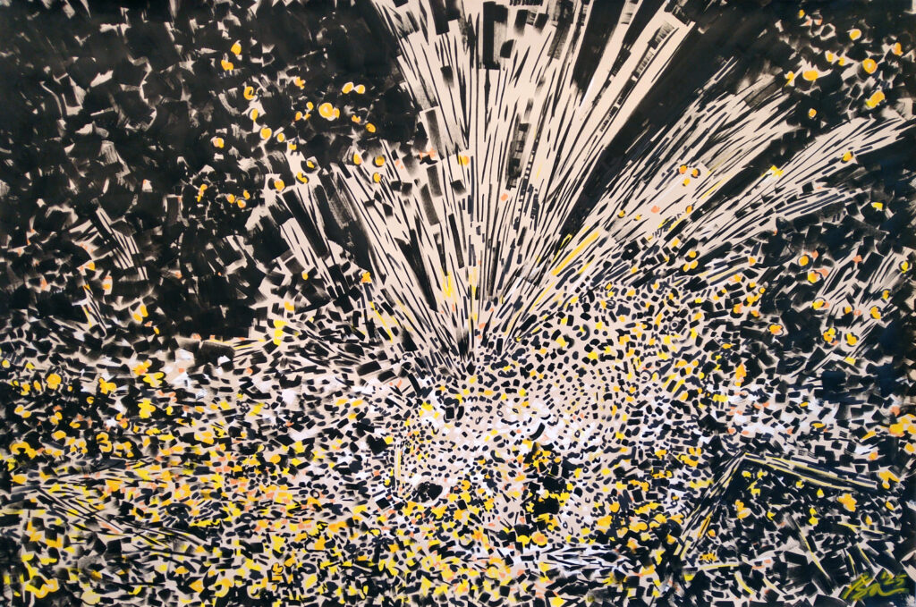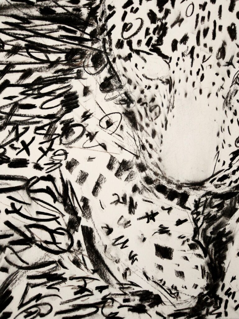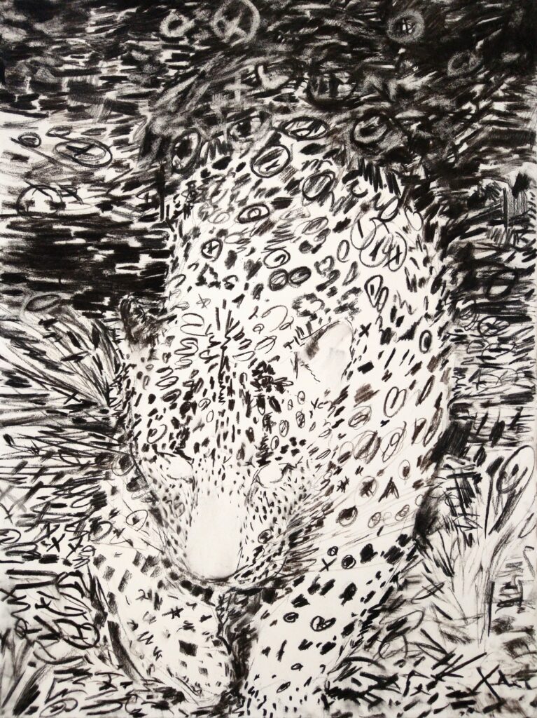 The Kalaira drawings respond to current conversations about migration, territory, and boundaries. Due to their size and scale, the drawings become “bodies” that the viewer must navigate. The lush surfaces pull viewers in close, dissolving the difference between the jaguar and its habitat, creating a space where a viewer can’t distinguish subject from environment.