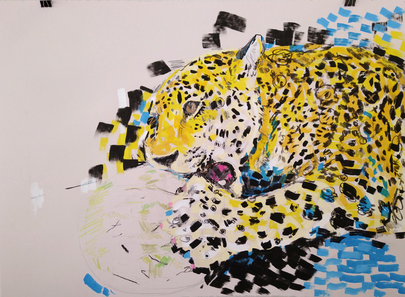 A large drawing by Isa Rodriguez shows a jaguar with abstracted spots tearing into a large, round, unidentified shape.