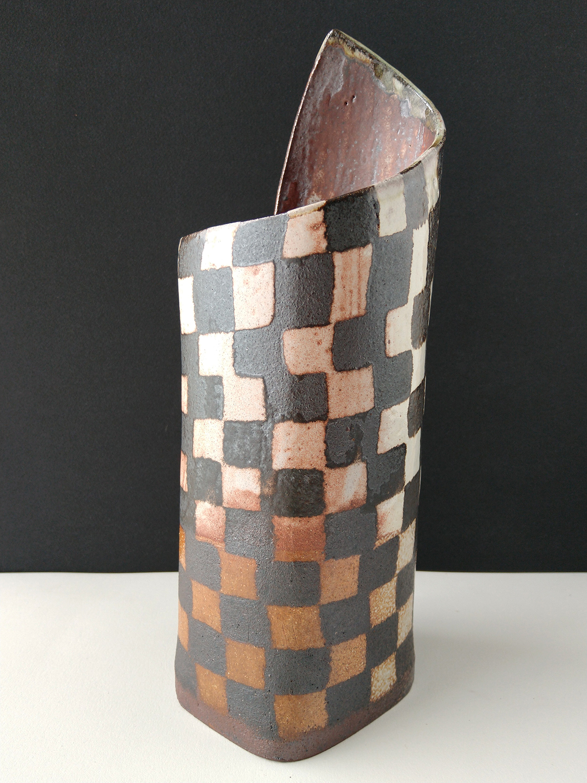 A large ceramic vase sits on the table. The vases surface is covered in a contrasting pattern of smooth, pale clay and rough, dark clay.