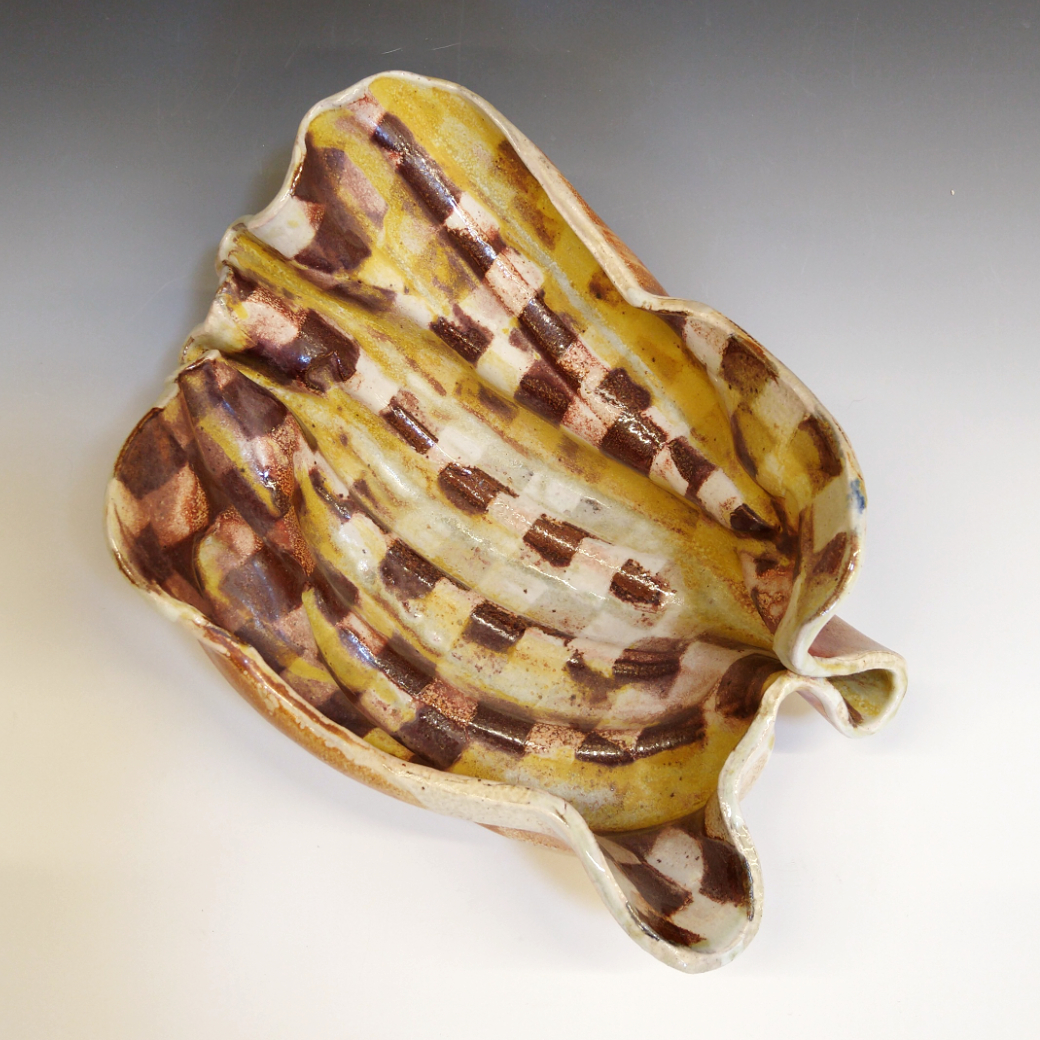 I created this piece by draping a slab of patterned clay over a bunch of fresh bananas, then applying gentle pressure to the clay until it took on their form. Later, I removed the fruit, which created long hollow shapes inside the bowl.