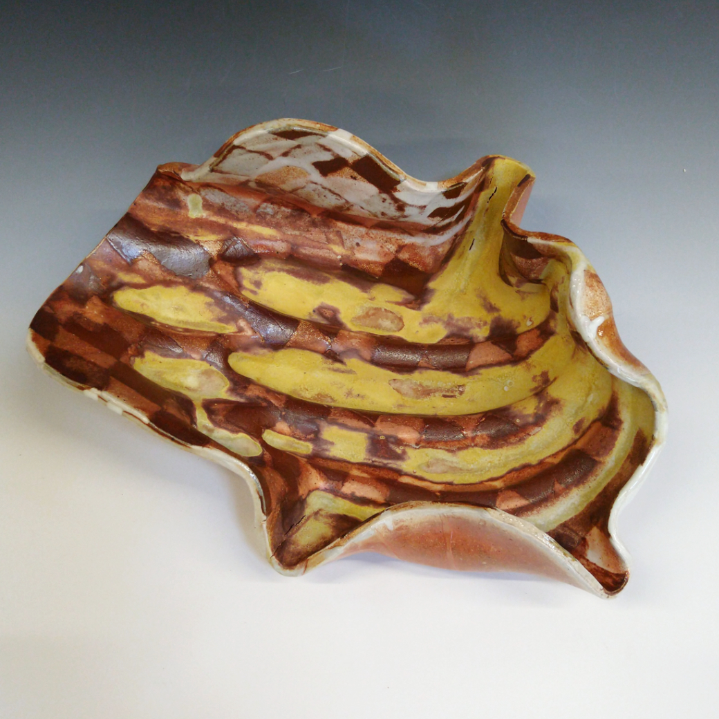 Slab-built stoneware fruit bowl in a nerikomi checker. Soda-fired.