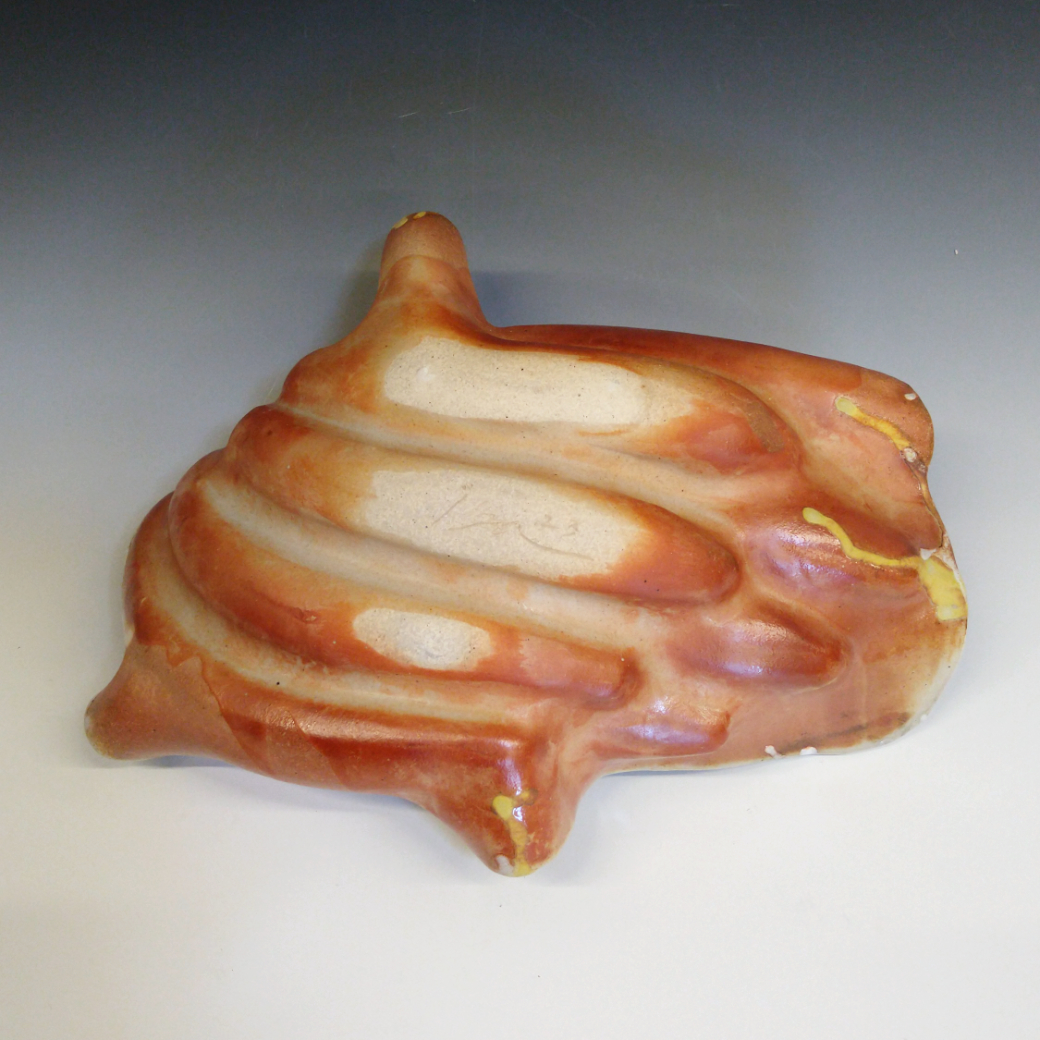 I created this piece by draping a slab of patterned clay over a bunch of fresh bananas, then applying gentle pressure to the clay until it took on their form. Later, I removed the fruit, which created long hollow shapes inside the bowl.