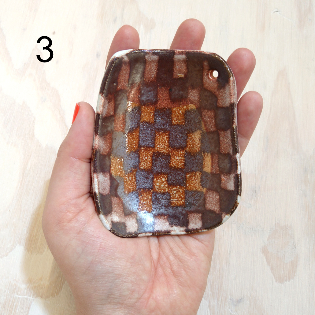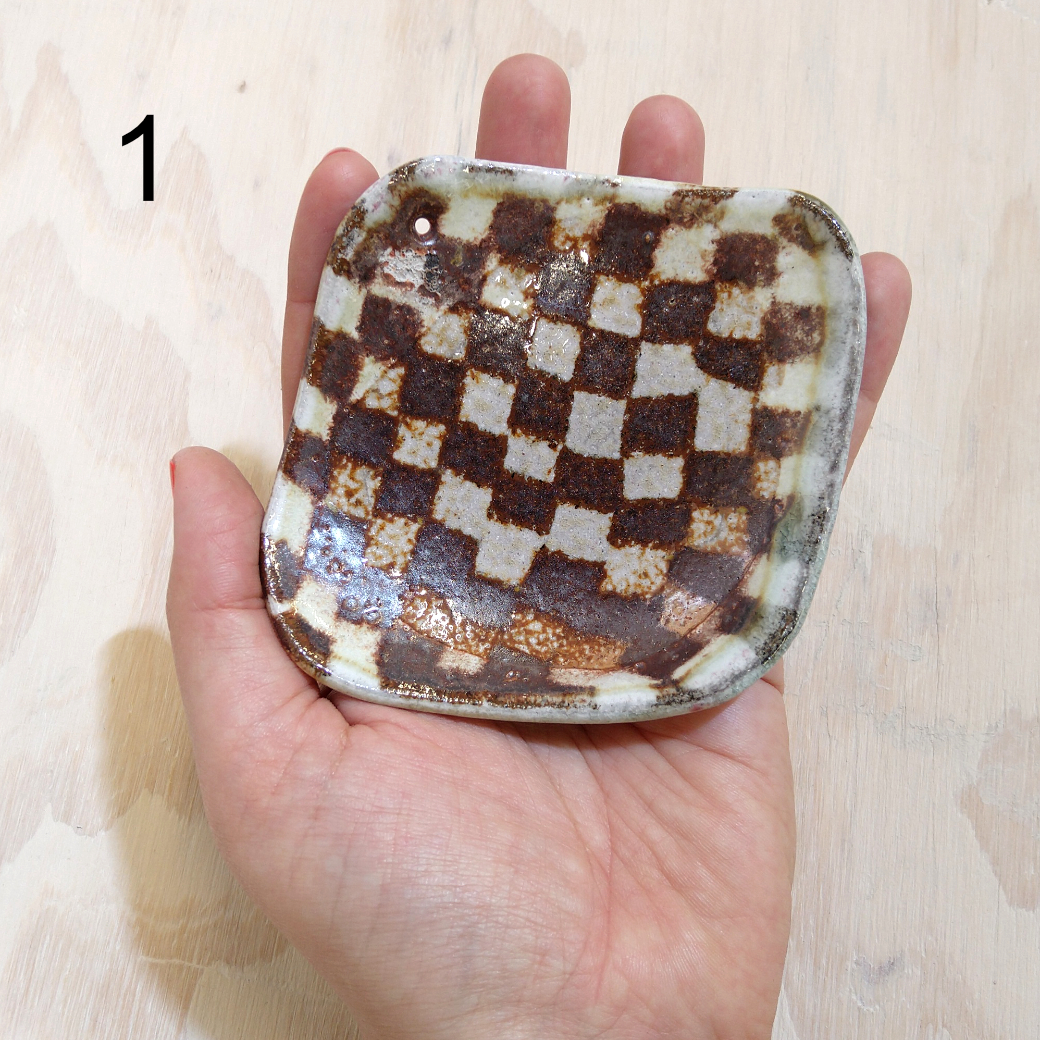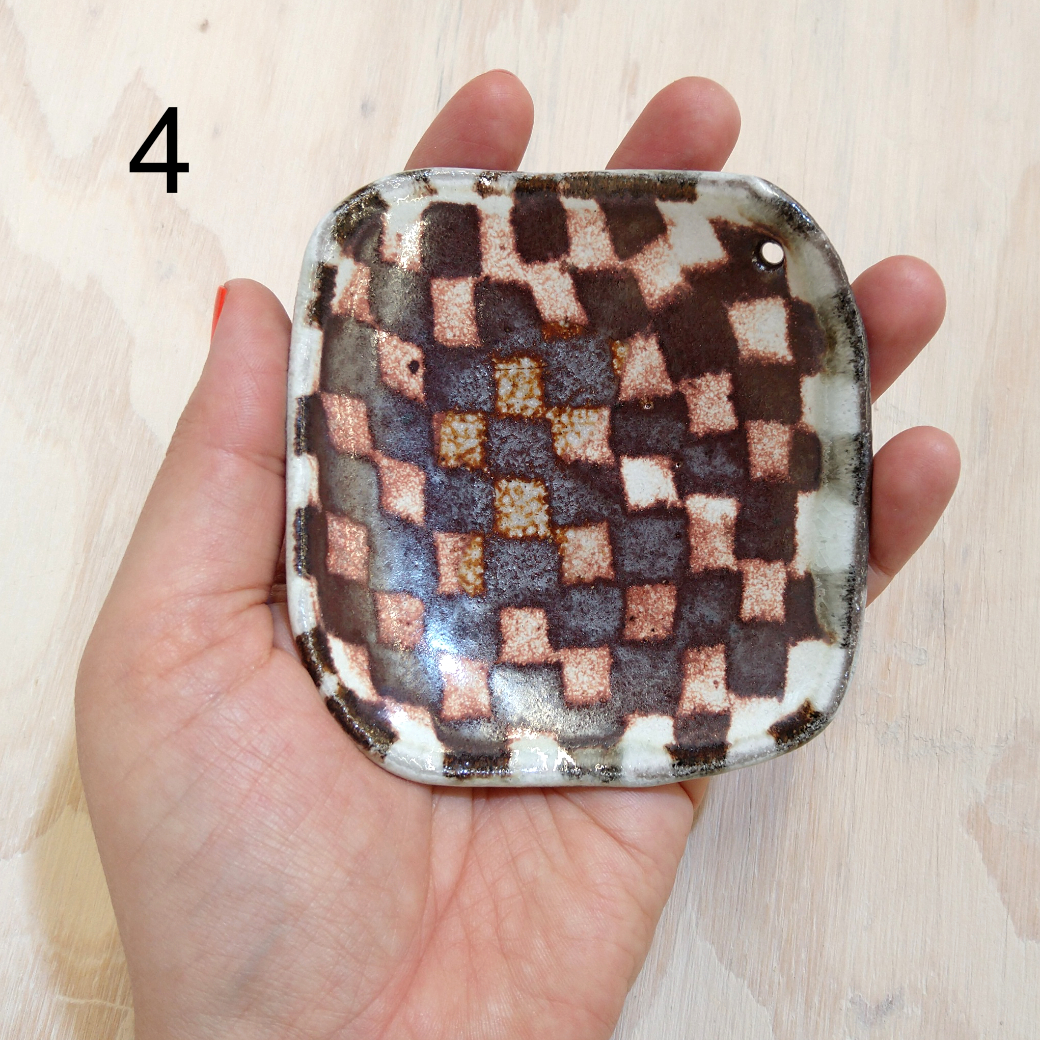 These pieces are made in a nerikomi checker pattern of iron red and white stoneware. Nerikomi is a Japanese technique for layering different colors of clay to create intricate patterns.